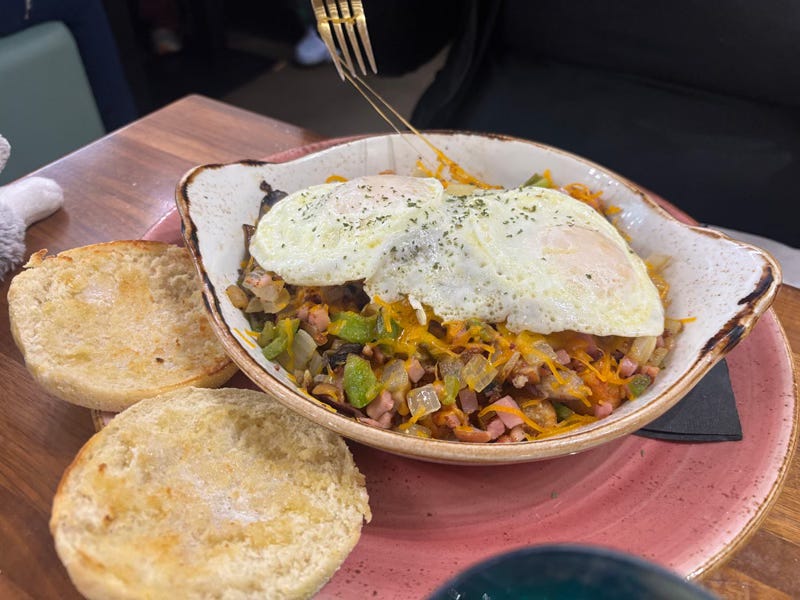 The Era’s Skillet ($17) wasn’t much more than the total of its bits (breakfast potatoes, cheddar, ham, bacon, sausage, onions, tomatoes, bell peppers, mushrooms) but those bits were all quite tasty, skillfully cooked and seasoned, and balanced in proportion to each other.