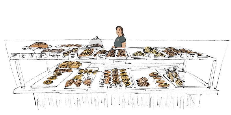 The vibe will be familiar to anyone who’s been in a café. There’s a long counter packed full of baked goods and deli items where you can stand and point at the item you want and then immediately regret not pointing at three more things.