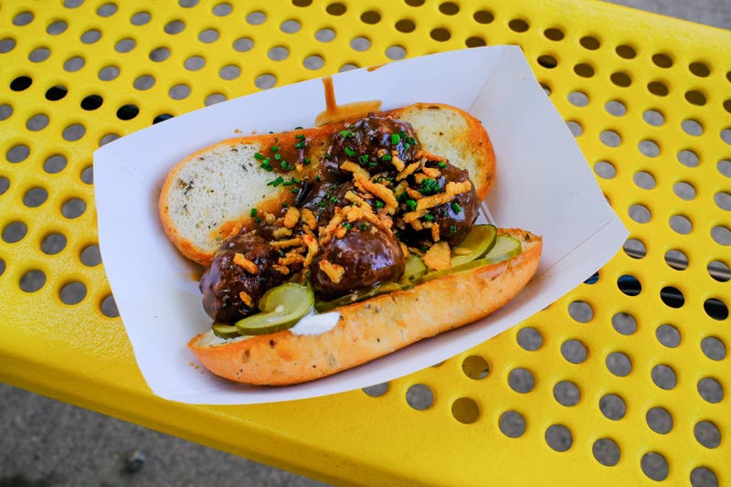I don’t know what the usually reliably good Farmers Union was going for with this so-called “sub,” and I am not sure that they knew either. Dry, overcooked, slightly gritty meatballs floated in a sea of dull, insubstantial gravy. Fried onions and a smear of sour cream were the right idea but didn’t save the dish. We didn’t hate this sandwich, but nor did we love it. And at $17, it really should bring prairie thunder to our Fair-ready palates.